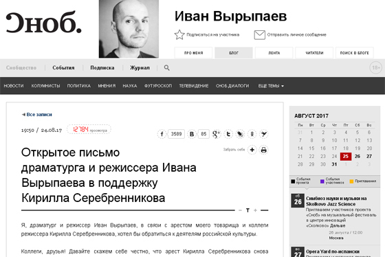На сайте журнала «Сноб» снова появилось письмо драматурга и режиссера Ивана Вырыпаева в поддержку художественного руководителя «Гоголь-центра» Кирилла Серебренникова. Ранее оно было удалено, поскольку редакция издания сочла необходимым проверить текст на соответствие российскому законодательству.