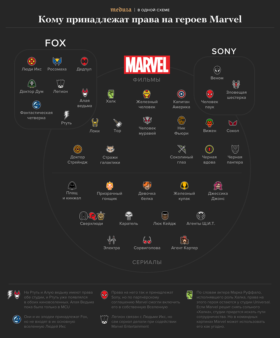 В конце 90-х студия комиксов Marvel начала новый виток продаж прав на экранизацию собственных комиксов. За несколько лет у нее купили права на самые популярные ветки персонажей: 20th Century Fox приобрела людей Икс, а также Фантастическую четверку, а Sony купила Человека-паука. Но в 2004 году в Marvel понимают: вместо того чтобы продавать лицензии на персонажей сторонним студиям, намного выгоднее делать экранизации самим. Так у Marvel появилась собственная киностудия и сложилась нынешняя структура принадлежности персонажей: люди Икс и Фантастическая четверка со всеми сопутствующими героями до сих пор относится к Fox, Человек-паук у Sony, а студия Marvel сохраняет права на всех остальных. При этом студии вынуждены постоянно сотрудничать друг с другом. Например, Sony заключила с Marvel партнерское соглашение, позволившее создать новое воплощение Человека-паука в рамках киновселенной Marvel.