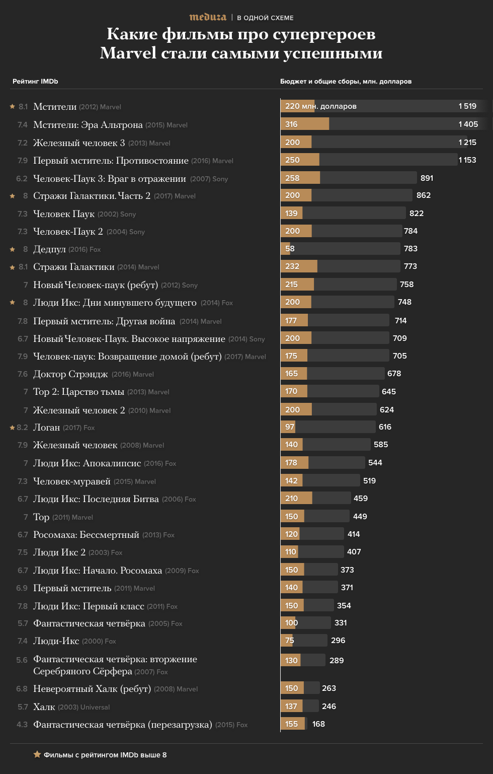 Экранизация комиксов Marvel оказалась чрезвычайно прибыльным делом. Абсолютно все фильмы по этой вселенной окупились — даже те, что были холодно встречены фанатами и критиками. Важный фактор кассового фильма — узнаваемость его главного супергероя. Чем больше людей его любит, тем больше пойдет на него в кино — даже вопреки негативным отзывам критиков. Близкой к коммерческому провалу оказалась только перезагрузка истории про Фантастическую четверку, вышедшая в 2015 году. Доходы от картины превысили бюджет лишь на 10 миллионов. Другие фильмы обычно приносили намного больше. Но собственная студия Marvel — абсолютный рекордсмен по сборам: сразу два их фильма (первые и вторые «Мстители») до сих пор входят в топ-10 самых кассовых картин за всю историю. На пользу Marvel играло то, что студия в одной картине всегда собирает целую команду супергероев, — в итоге ради каждого из них приходит целая армия поклонников.