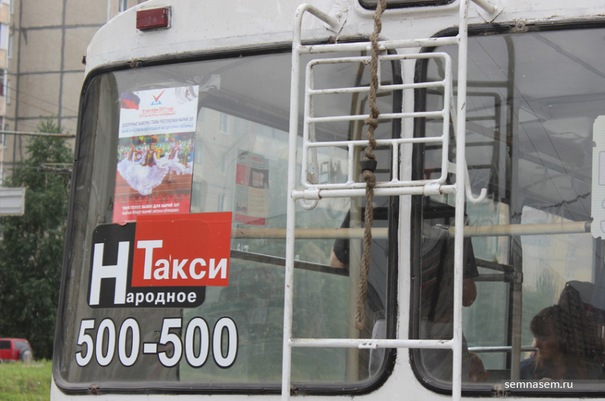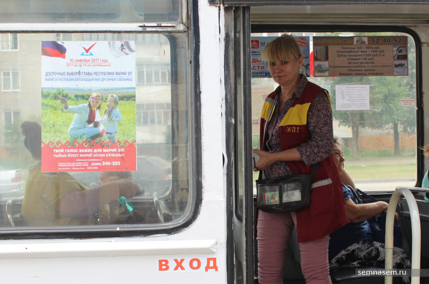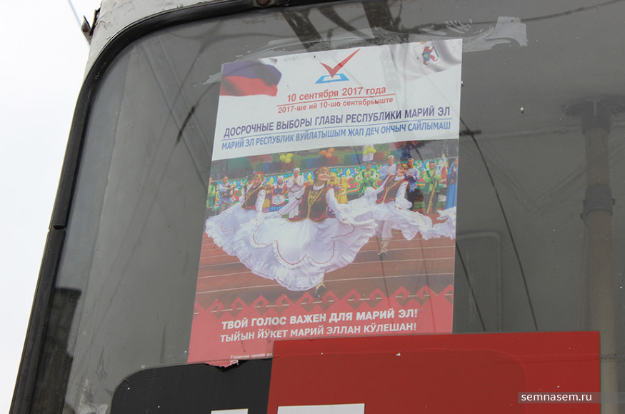 В прошлом году за право размещать агитацию в маршрутках и троллейбусах была «война». Сейчас маршрутки аполитичны, агитации на них не видно. В троллейбусах плакаты от ЦИК Марий Эл информируют о том, что 10 сентября в республике состоятся выборы главы региона.
