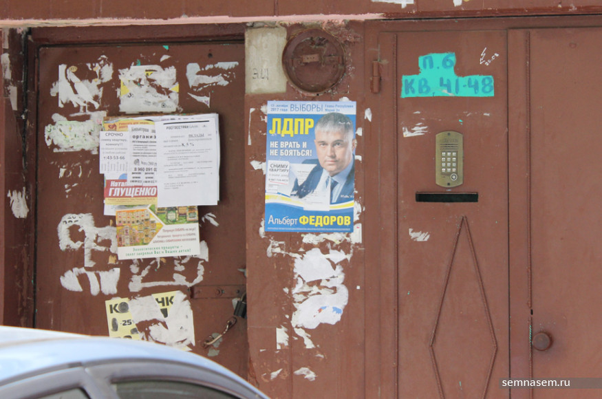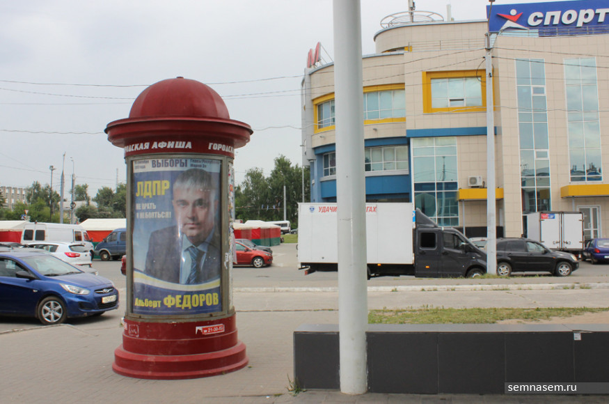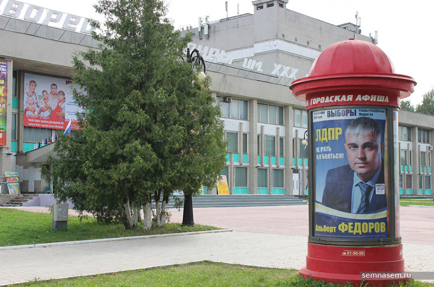 В Йошкар-Оле есть несколько афишных стоек, на которых есть относительно большие (два на метр) плакаты Альберта Фёдорова из ЛДПР. Один из них расположен в людном месте — у ДК имени 30-летия Победы. На афиши пока никто из других кандидатов не претендует.