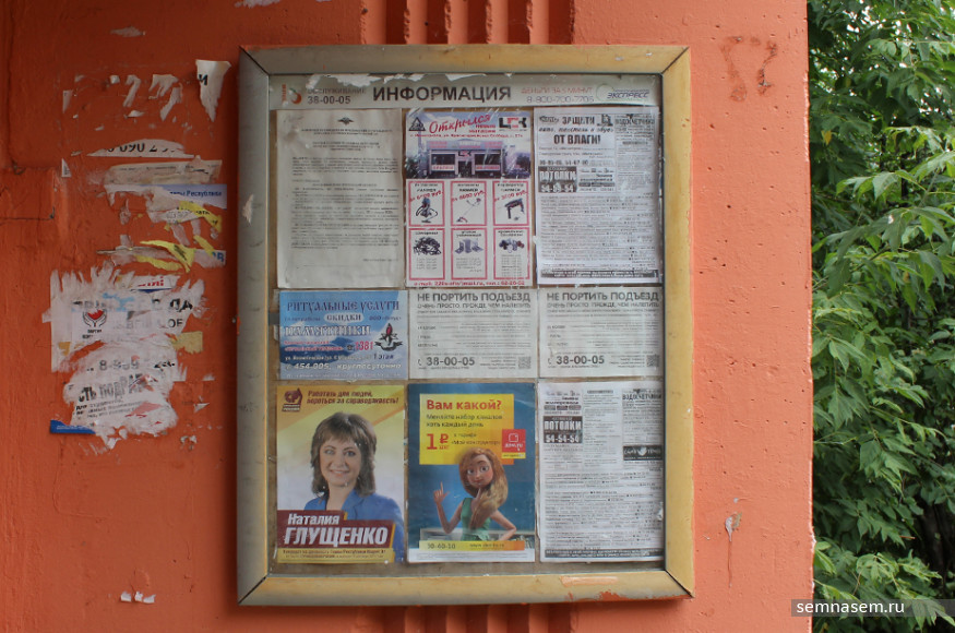 Есть еще аккуратные (возможно, информация в них размещается за плату или по договоренности) застекленные стенды. На большинстве подъездных площадей можно увидеть плакат одного кандидата — Наталии Глущенко из «Справедливой России». В Сомбатхейском микрорайоне и центральной части Йошкар-Олы в конце августа она опережает своих соперников. Плакаты Альберта Фёдорова (ЛДПР) встречаются гораздо реже. О кандидате от Партии пенсионеров Валентине Злобиной информации корреспондент «7x7» не нашел.