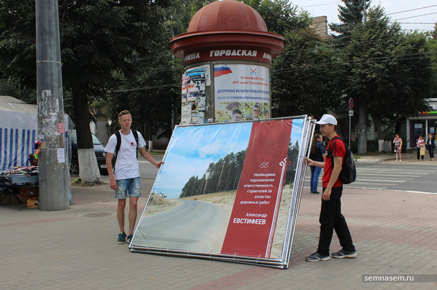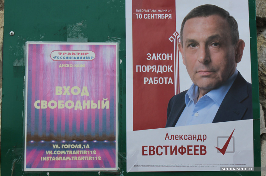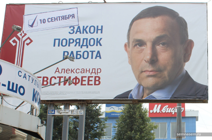 Очень содержательно высказался на тему использования рекламных пространств в Йошкар-Оле и республике врио главы Марий Эл Александр Евстифеев. Он во время выступления на праймериз «Единой России» 26 мая возмутился, что республика не получает денег от рекламы. Эти праймериз закончились победой Евстифеева, чуть позже он стал кандидатом на должность главы Марий Эл. Прошло еще несколько дней, и в Йошкар-Оле демонтировали несколько больших придорожных рекламных щитов.