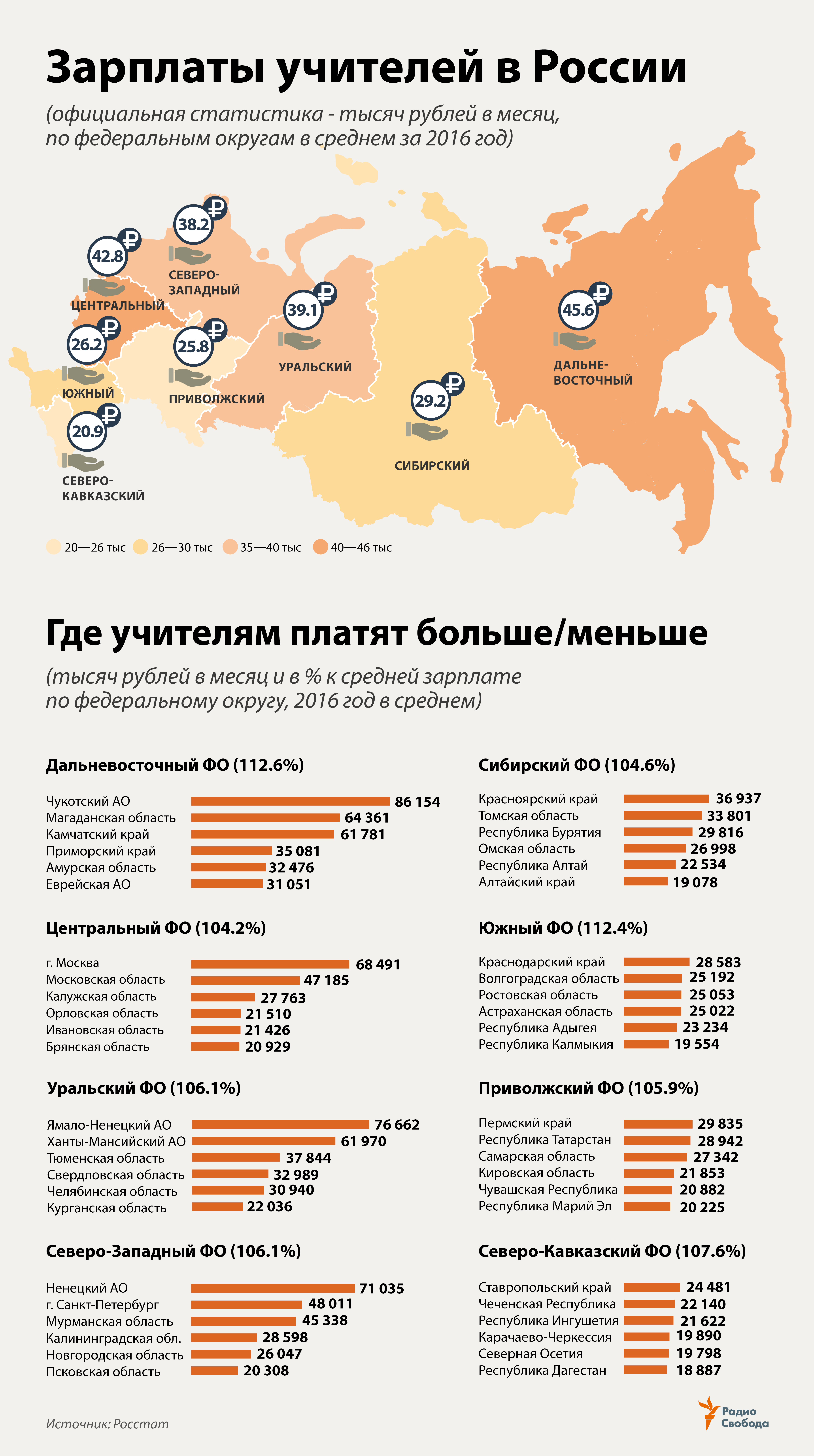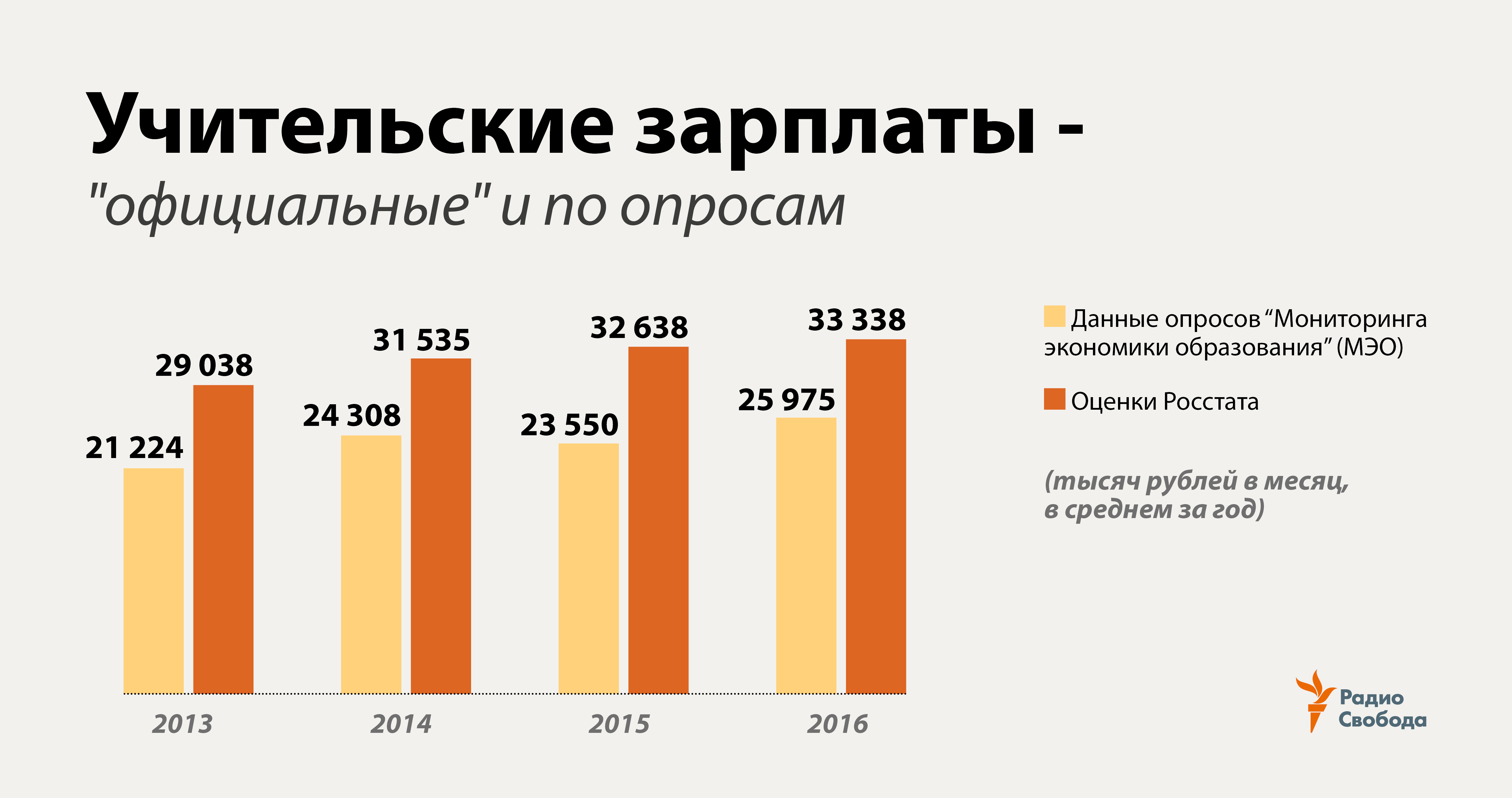 А опрос, проведенный "Общественным российским телевидением" в феврале 2017 года, и вовсе показал, что средняя зарплата учителя в стране составляет… 18 тысяч рублей в месяц ($310). Притом что в 59 регионах из 85, если судить по более чем тысяче сообщений в этом опросе, зарплата составляет 10–20 тысяч рублей. Хотя, понятно, во многих случаях речь могла идти о сумме, которую учитель получает на руки, а не официально ему начисленной.