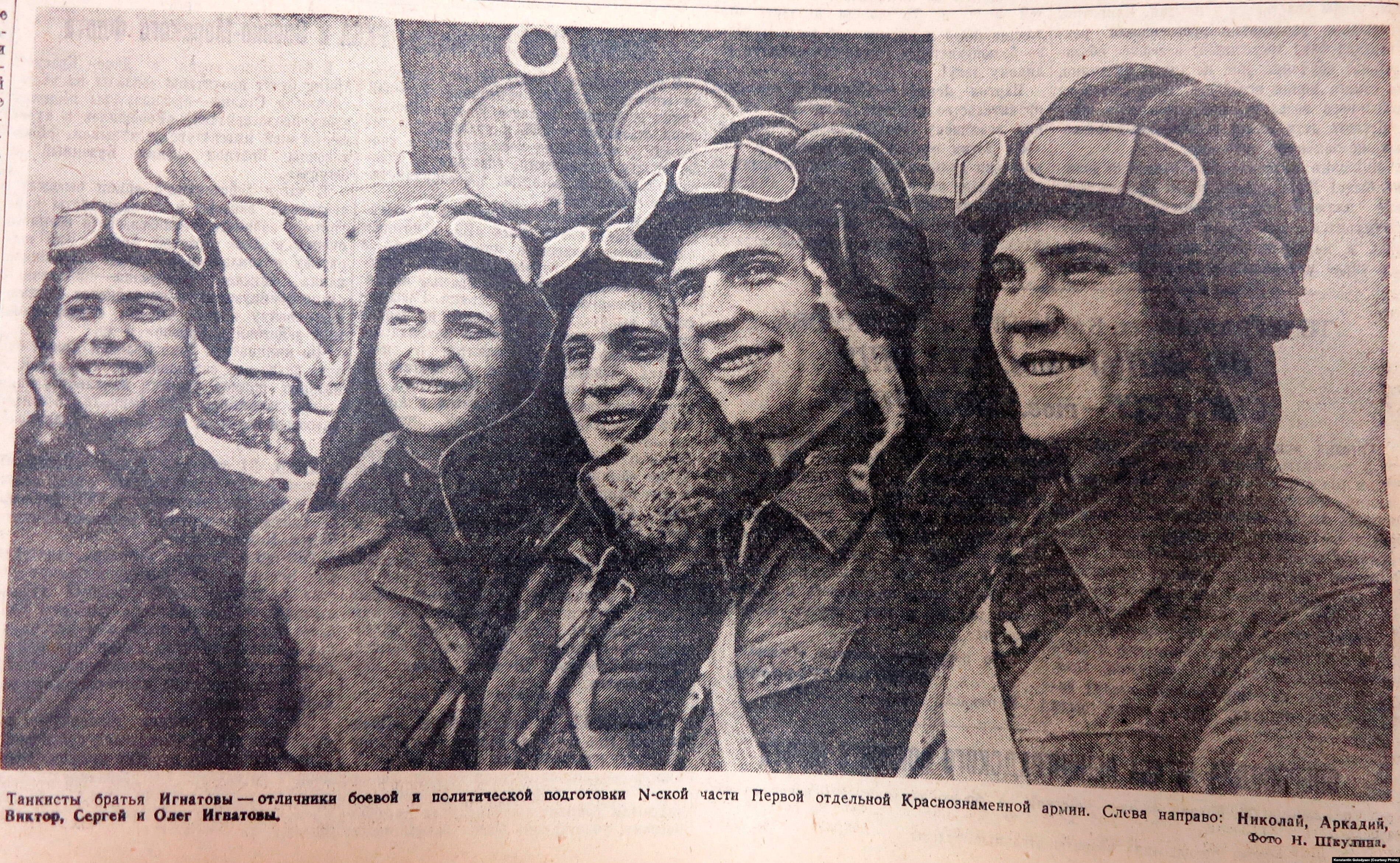 – В свое время они были прославлены. Исследования я начал с того, что взял подшивку "Советской Сибири", нашей областной газеты. Оказывается, начиная с сентября 1939 года о братьях из многодетной семьи Игнатовых стали писать достаточно часто, едва ли не ежемесячно. Причем и в местной, и в центральной прессе. Тогда за это нельзя было не ухватиться: одновременно в армию призываются четыре брата, четыре красивых стройных человека. Причем их сама мама приводит в военкомат. У пятого призывной возраст еще не наступил, но она настояла, чтобы взяли и его. И вот они все впятером едут на Дальний Восток, в 48-ю танковую бригаду Первой отдельной Краснознаменной армии. Служат в одном полку, учатся на два экипажа танкистов. Через полгода к ним дослали еще шестого брата, Владлена. На страницах газет тут же появляются приветственные слова военкомов. Тут же братья попадают в президиумы всех заседаний. Их везде ставят в пример.