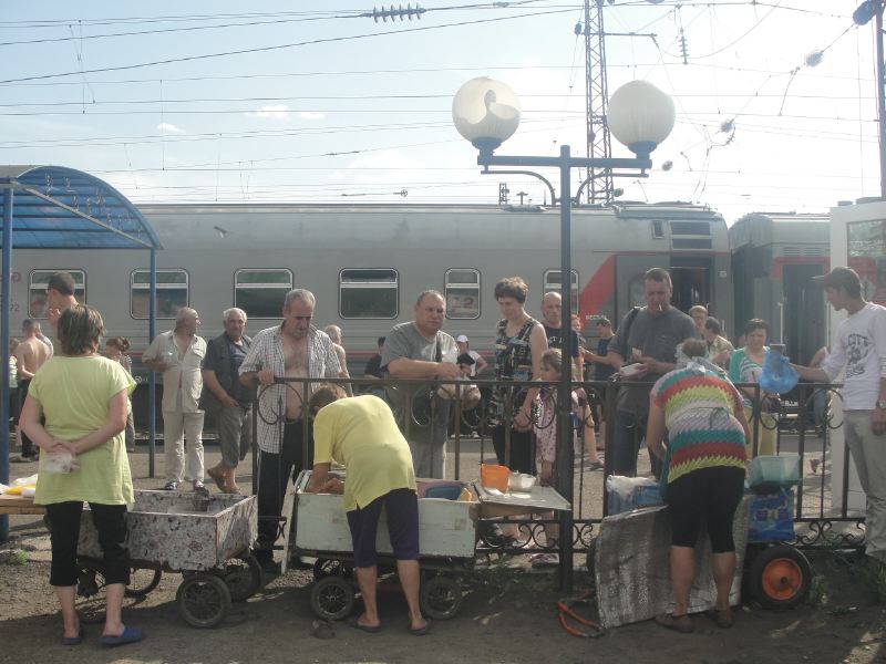 — Картошка с курицей! Картошечка, девочки, берем! Курочка жареная! — на станции Улан-Удэ аккуратная уставшая женщина достает из сумки одну за одной пластиковые упаковки с домашней едой. Говорит, раньше работала в ресторане на вокзале, он закрылся, а теперь, в пятьдесят пять лет, ее на работу не берут. Покупаю у нее обед себе и проводнику Славе: ему нельзя отходить от вагона, на вагон-ресторан у него нет денег, а я уже волнуюсь за него.