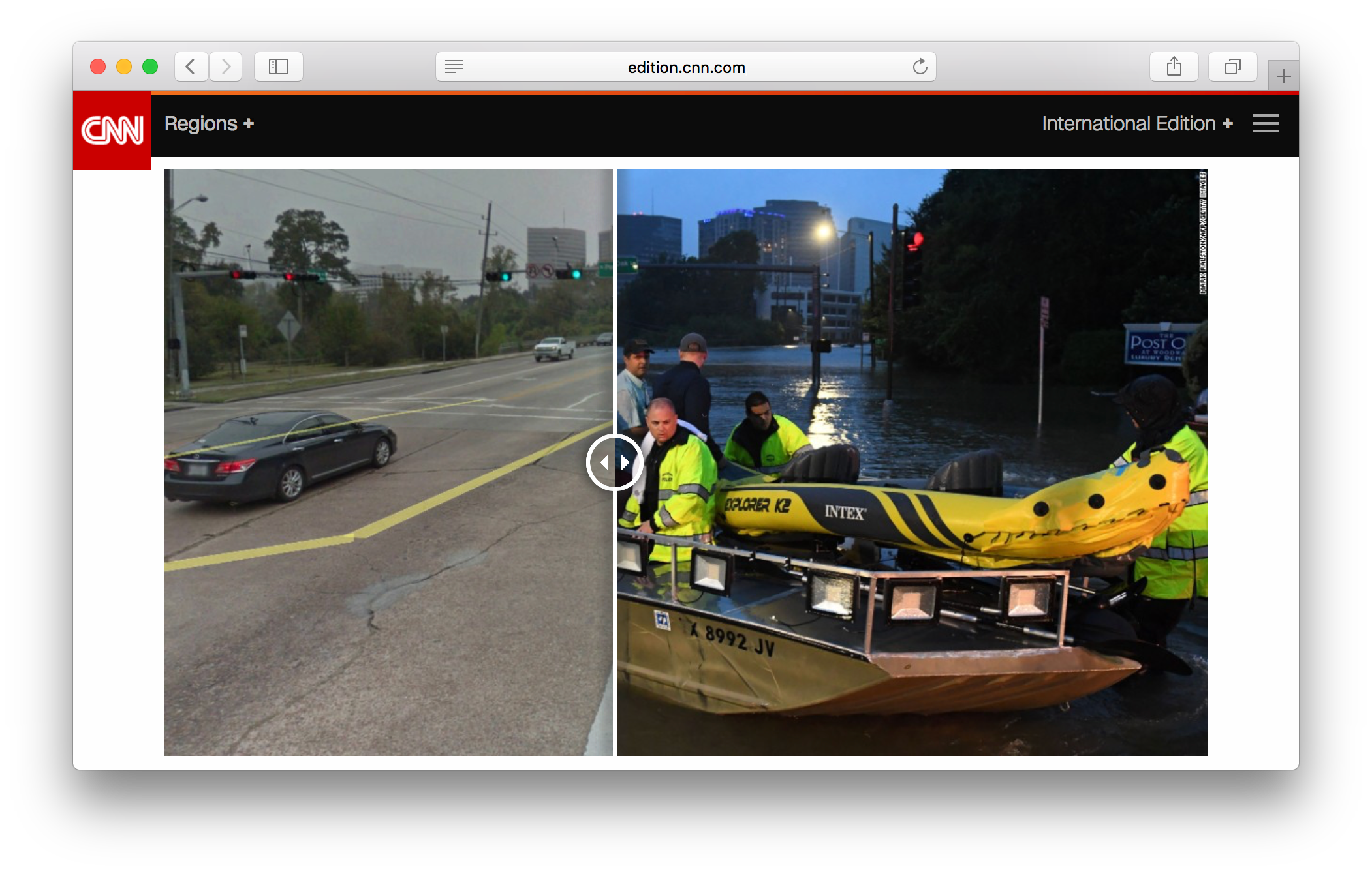 CNN тоже сравнил Хьюстон до и после «Харви», но на фотографиях: пользователи могут двигать слайдеры на фото влево-вправо, чтобы оценить последствия наводнения.