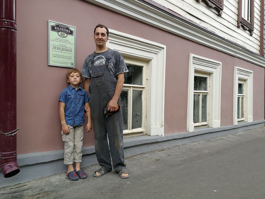 Последний раз Костин дом красили к приезду Брежнева. Тогда из пульверизатора его покрыли розовым цветом вместе с окнами. За годы краска облезла, кое-где подгнила обшивка. Костя мечтал заняться фасадом, но руки не доходили. А в прошлом году пришли волонтеры «Том Сойер Феста» и рассказали Косте, что хотят покрасить его дом. Костя обалдел от такого счастья и присоединился. Вместе с жителями Казани он отремонтировал и покрасил фасад всего здания, хотя ему по-прежнему принадлежит только второй этаж. Этим летом заменил ворота и забор.