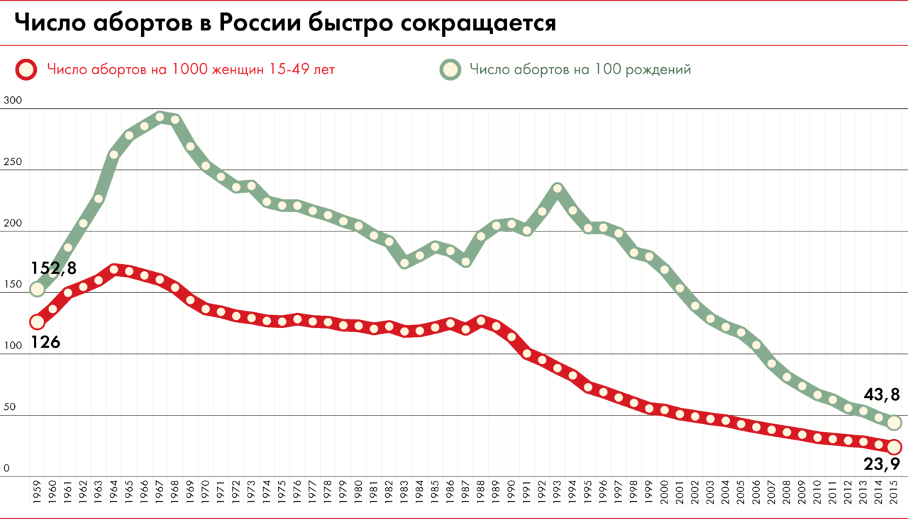 Знаменательные перемены начались с конца 1980-х. Постсоветская Россия стала быстро наверстывать упущенное, и сейчас можно с определенностью утверждать, что примерно с середины 1990-х контрацептивная революция идет и в нашей стране. Едва ли не самое яркое свидетельство этого — быстро сокращающееся число абортов.