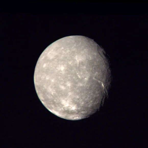 Самый подробный снимок этого спутника, сделанный «Вояджером-2», демонстрирует многочисленные разломы и долины. Диаметр Ариэля — 1200 км, снято его южное полушарие. 24 января 1986 года. Расстояние — 130 тыс. км.
