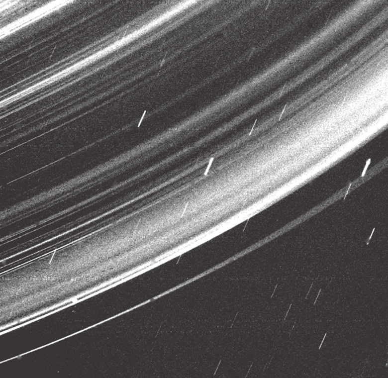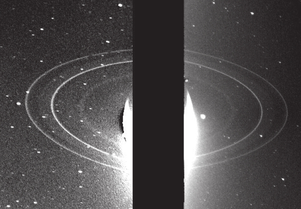 Просмотр «с тыловой подсветкой» демонстрирует непрерывное распределение мелких частиц по всей системе колец. 24 января 1986 года. Дальность — 237 тыс.км.
