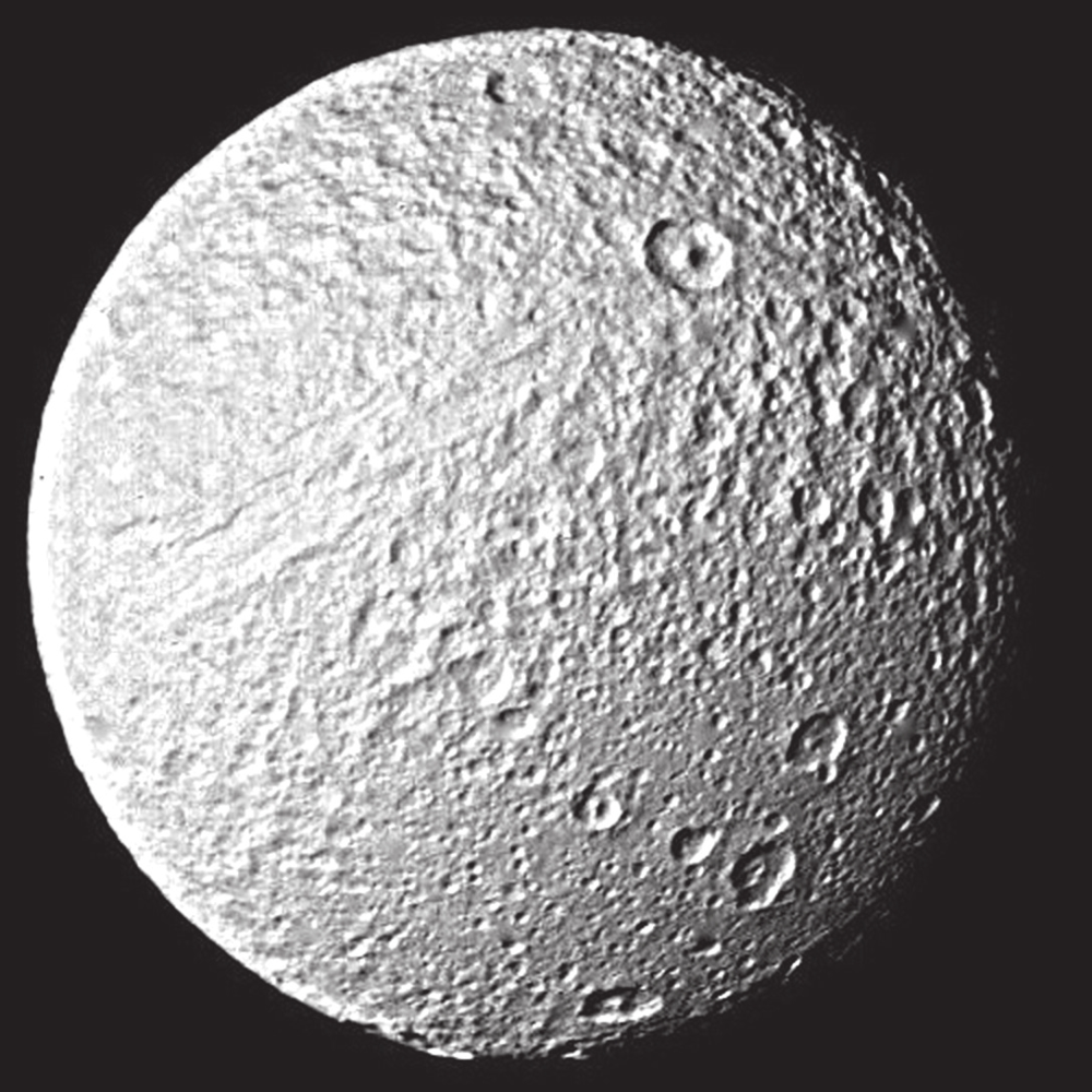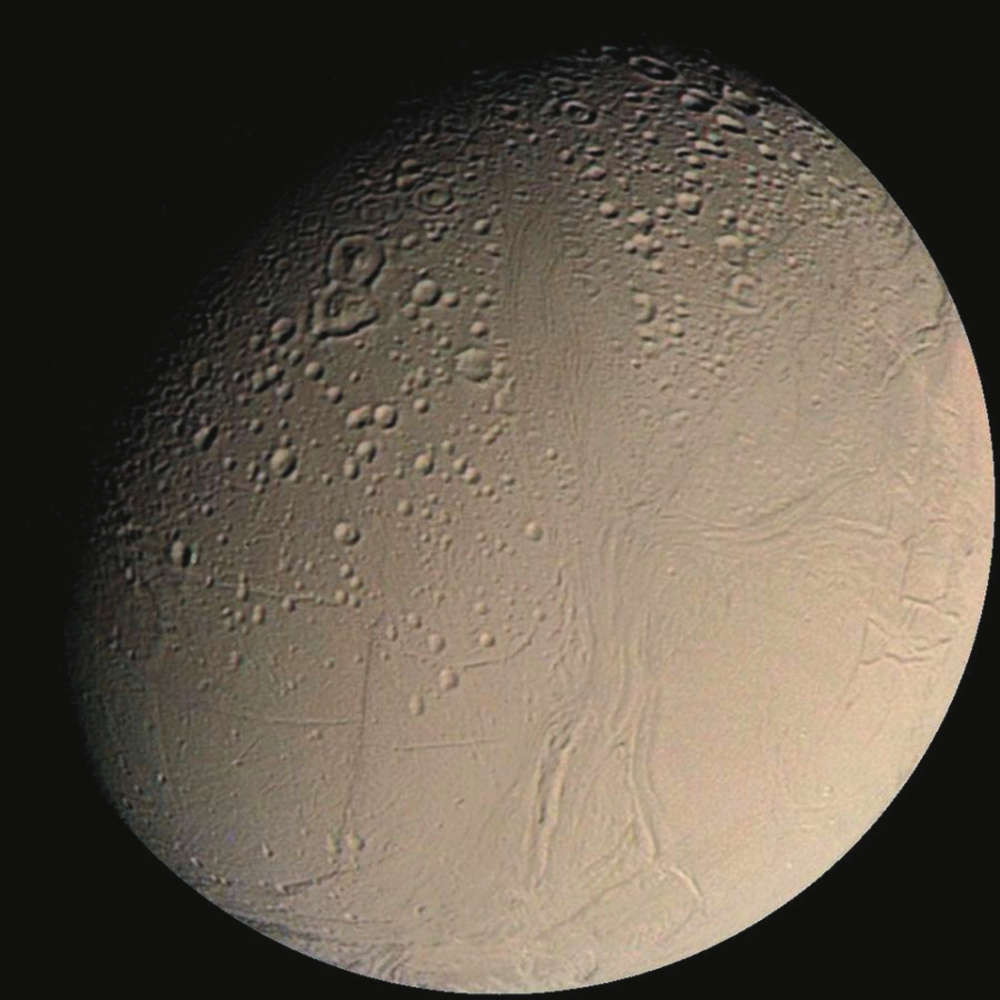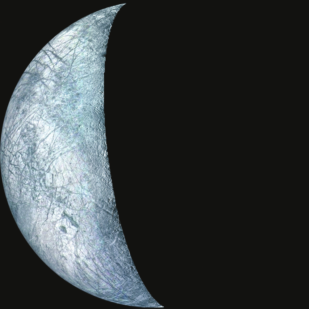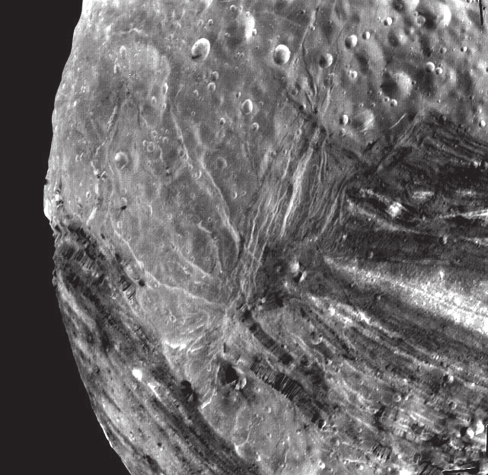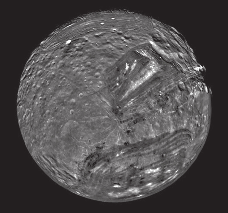 Снимок (точнее, мозаика снимков) Европы, сделанный «Вояджером-2». Еще одно откровение. Планета в ледяном панцире с разломами, тянущимися на тысячи километров. Кстати, такие же разломы в виде двойных хребтов видны и на снимке Тритона. Есть масса признаков того, что подо льдом — водный океан, в котором даже возможна жизнь.