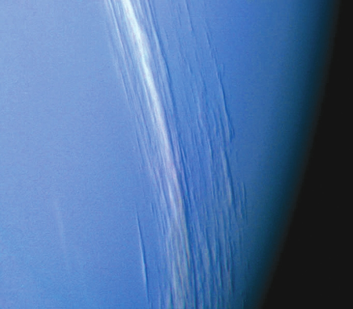 Широтные облака Нептуна, снятые за два часа до максимального сближения с планетой 25 августа 1989 года (5 тыс. км над северным полюсом). Благодаря низкому солнцу виден вертикальный рельеф облаков.