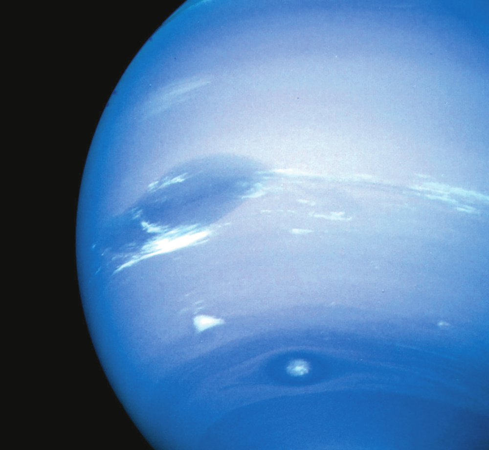 Голубой цвет Нептуна и Урана имеет ту же природу, что и голубой цвет неба, — рэлеевское рассеяние, к нему добавляется поглощение красного цвета метаном. Облака на этих планетах находятся глубже, чем на желтоватых Юпитере и Сатурне, отсюда и разница в цвете. Верхние облака на Нептуне — на уровне давления 1,2 бара — глубже, чем поверхность Земли; на Уране — еще вдвое глубже. Вероятная причина — слабая конвекция в атмосфере, особенно на Уране. По данным «Вояджера-2», заметного внутреннего источника тепла нет ни на Уране, ни на Нептуне. Но если Уран вообще лишен видимых деталей, то на Нептуне их несколько. Прежде всего — Большое темное пятно, вихрь-антициклон, наблюдаемый годами (но не столетиями, как Большое красное пятно Юпитера), — его теперь видит «Хаббл». Южнее есть второе темное пятно со светлой сердцевиной. Еще — широтные полосы облаков и облачный треугольник, прозванный «Скутер». Все детали перемещаются с разными угловыми скоростями, и то, что на снимке они оказались на близких долготах, — случайность. Скорость передвижения облаков Нептуна достигает 2100 км/ч.