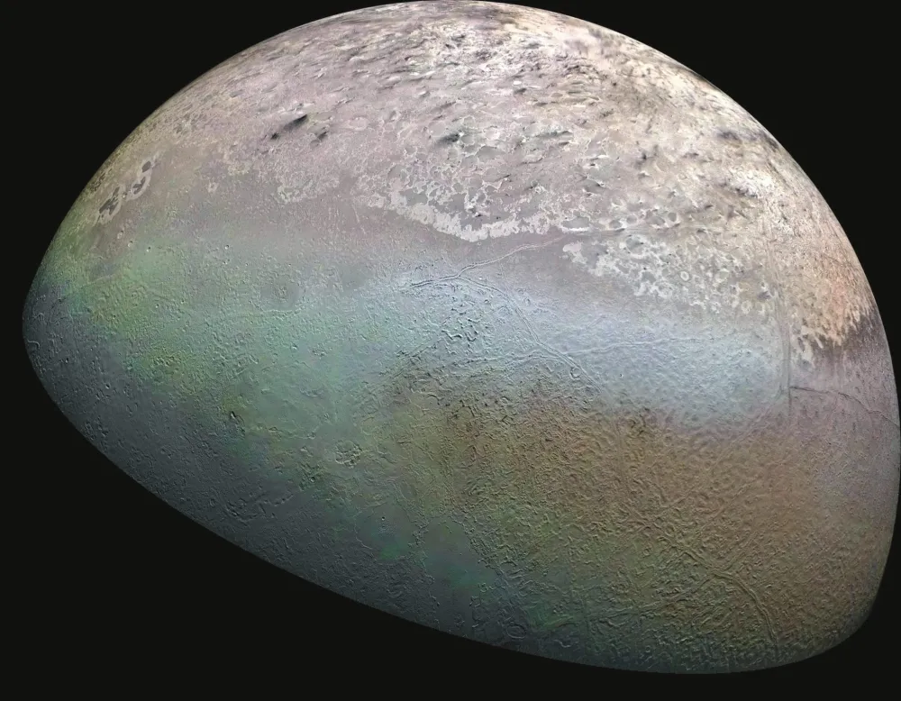 Тритон — собрат Плутона. Они находятся на сопоставимых расстояниях от Солнца и почти одинаковы по размеру (Тритон чуть больше — 2707 км, Плутон — 2374 км). Существенная разница, однако, в том, что Тритон греется изнутри за счет приливного взаимодействия, поскольку захвачен планетой-гигантом. Этот спутник имеет азотную атмосферу с еле заметными облаками, которые видны на некоторых снимках на лимбе (Плутон — тоже).