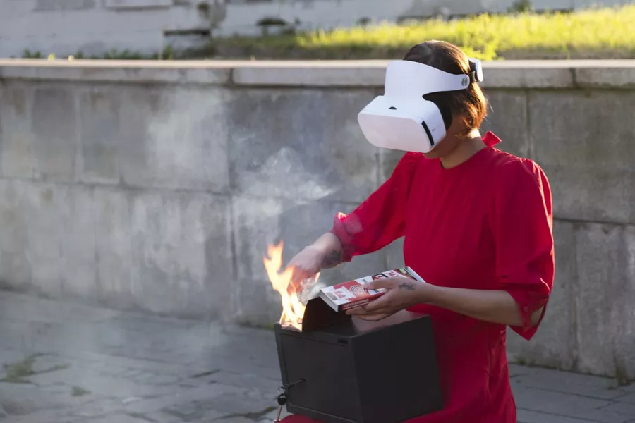 «На 21-й день ношения очков виртуальной реальности и попыток передвижений в них в городе, мне сложно различать состояние в очках и без них» — говорит Катрин. За время, проведенное на границе реального и виртуального, политического и личного, искусства и преступления, нормы и сумасшествия, художница обретает новую идентификацию. Чтобы окончательно стереть различия между собой и обитателями интернатов в финале акции, Катрин лишает себя единственного признака гражданской самостоятельности, который имеет значение в ПНИ. Она сжигает свой паспорт гражданина РФ в несгораемом сейфе напротив Дома Правительства. Границы и условности исчезают. В финале Катрин остается в красном платье, как будто позаимствованном у Марины Абрамович, в своем новом теле, научившимся жить в двух мирах одновременно.