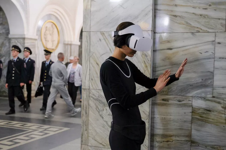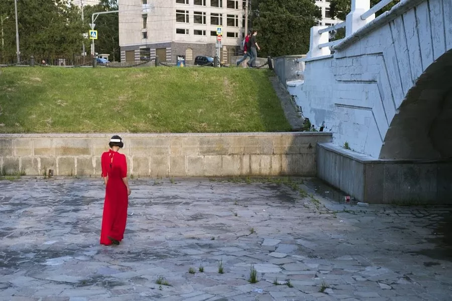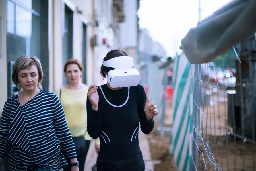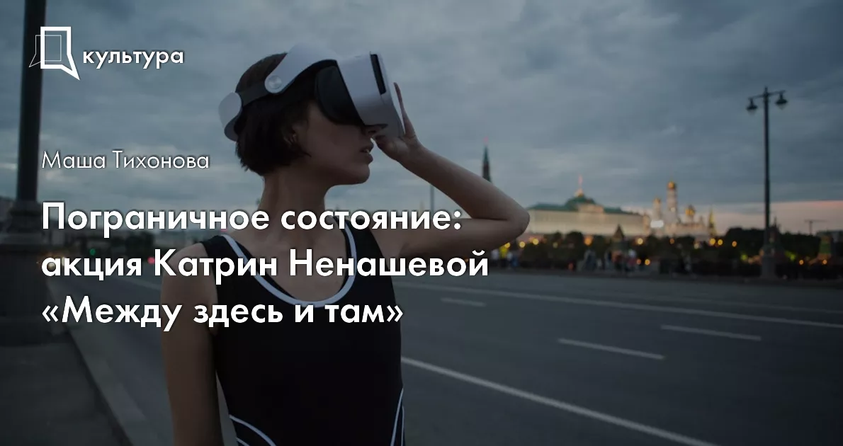 Этим летом художница-акционистка Катрин Ненашева вышла на улицы Москвы в очках виртуальной реальности. 23 дня она находилась в состоянии между здесь и там. Её тело в костюме человека с другой планеты на ощупь пробиралось сквозь толпу в метро и на оживленных улицах, в то время как перед глазами она видела бледно-зеленые коридоры московских психоневрологических интернатов. В очках, в которых Катрин передвигалась по городу, проецировались панорамы повседневной жизни людей, полностью изолированных от внешнего мира бетонным забором. Документацию акции в фотографиях, дневниках, видео- и аудиозаписях можно увидеть до 10 сентября в Государственной галерее на Солянке на первой персональной выставке художницы «Между здесь и там: истории городских изоляций».