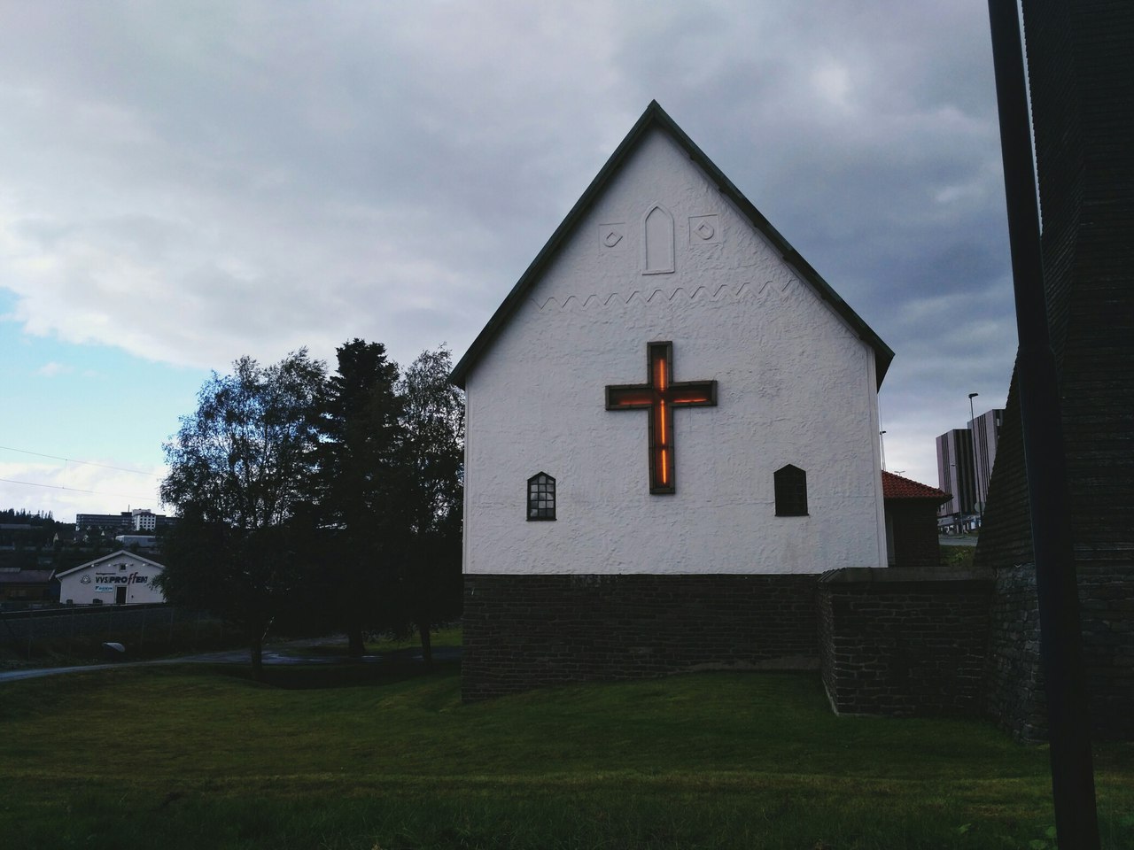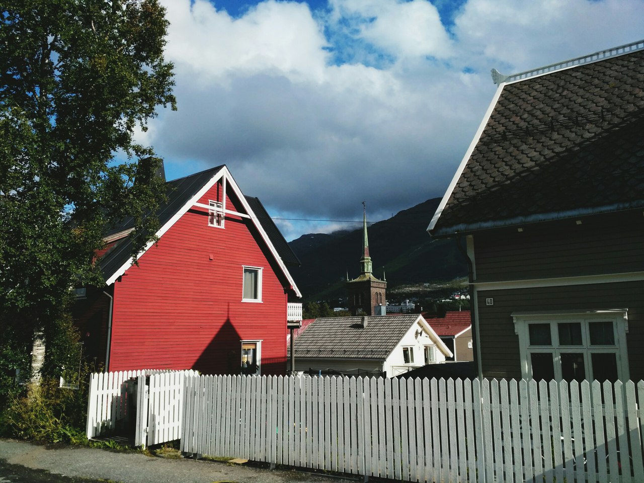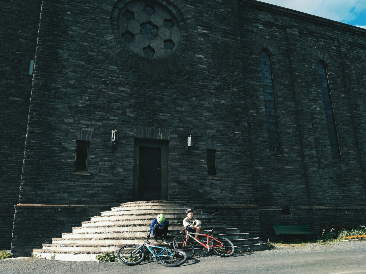 Дойдя до конца улицы, вышли к торговым центрам. Тут стало понятно, что Нарвик все таки больше Харстада и более привлекателен для туристов (в Харстаде торговых центров меньше, и самый крупный из них находится на приличном расстоянии от города). Купив мне теплый шарф (я плохо подготовилась к поездке) и поймав wi-fi, мы проложили себе маршрут к смотровой площадке на краю города и отправились в путь. Выглянуло солнце и, наконец, стало тепло. Мы прошли мимо красивой церкви, на ступенях которой отдыхали юные велосипедисты.
