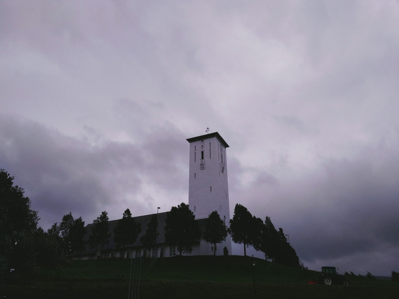 Наконец, мы нашли поворот, который, как нам показалось, был удачным местом для остановки автомобиля. Остановились и начали голосовать. Мимо проехало несколько машин, водитель одной из них сделал нам знак рукой, мол, «идите вперед». Мы послушно двинулись вперед, решив, что мужчина имел ввиду, что это неудачное место для остановки, и вдруг увидели, что эта машина затормозила метрах в 500 от нас и ждет. Мы удивились, обрадовались и со всех ног побежали к ней. В автомобиле сидело двое мужчин. Они сказали, что могут довезти нас до Харстада, но сначала им нужно подняться в гору, чтобы успеть купить алкоголь до закрытия магазина. Нас такая перспектива не очень радовала, поэтому мы попросили высадить нас на какой-нибудь заправке по дороге. Мужчины довезли нас до нужного им поворота и сказали, что если вдруг, когда они будут возвращаться назад, мы все еще будем стоять на дороге, они подбросят нас до Харстада. Мы поблагодарили их, попрощались и подняли большие пальцы вверх. Первая же встречная машина остановилась, и водитель сказал, что едет в Харстад. Это была большая удача. Мы ехали уставшие и счастливые, слушали хорошую музыку и любовались прекрасными видами. По дороге остановились на той же заправке, где днем встретили прекрасную пару испанцев. Над заправкой был холм, а на холме красивая церковь.