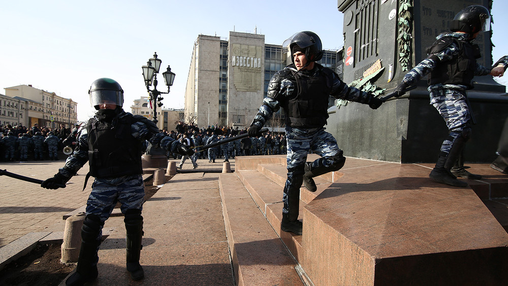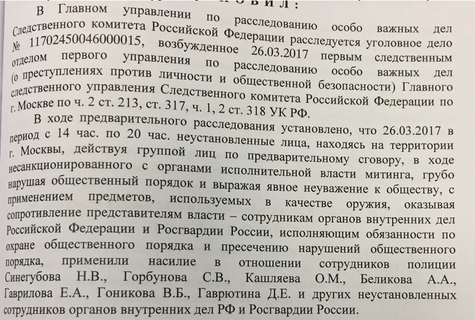 Сотрудники полиции во время акции оппозиции против коррупции на Пушкинской площади. Фото: Артур Новосильцев / ТАСС 15 May 2017, 16:00 В распоряжении Открытой России оказалось постановление СК РФ по уголовному делу о событиях на Тверской улице в Москве 26 марта 2017 года. Согласно документу, потерпевшими по делу являются 7 сотрудников полиции, а также «другие неустановленные сотрудники органов внутренних дел РФ и Росгвардии России». В настоящее время обвинение предъявлено четырем участникам акции: Александру Шпакову, Станиславу Зимовец, Андрею Косых и Юрию Кулию. Его дело уже передано в суд.