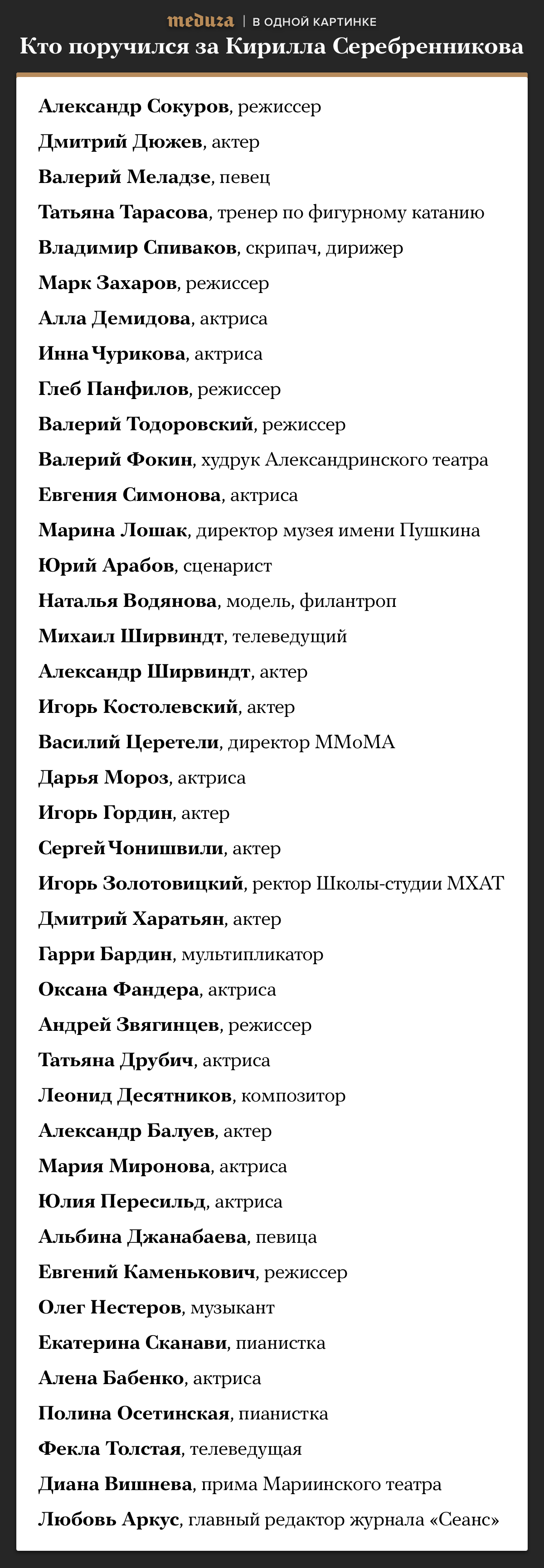В Мосгорсуде за Кирилла Серебренникова поручился 41 человек. Список