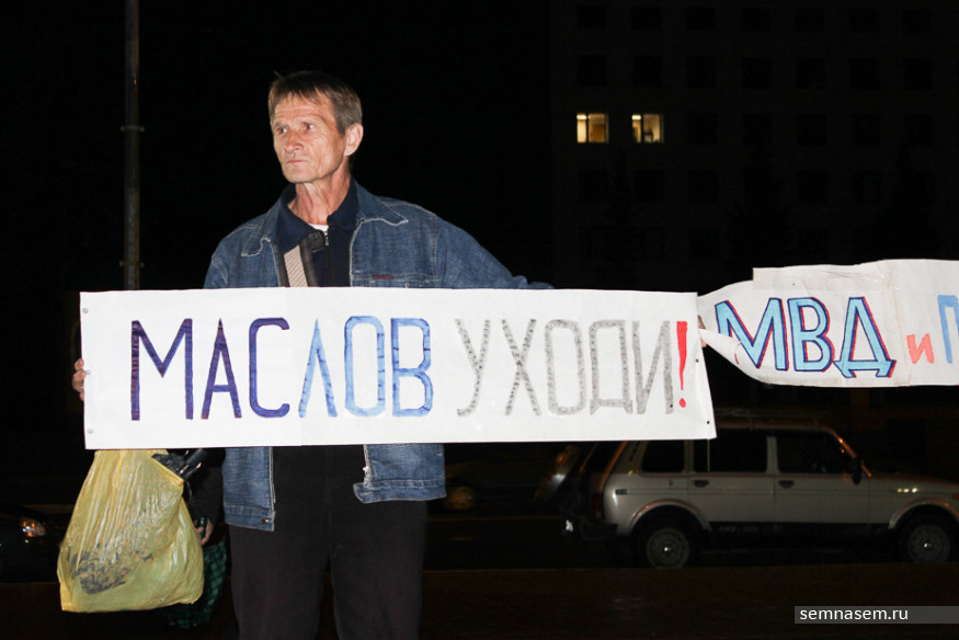 Державший плакат с призывом «Маслов, уходи!» участник пикета Михаил Волков рассказал о полицейских рейдах — вытесняют пенсионеров, торгующих на улицах овощами с огородов и лесными ягодами.