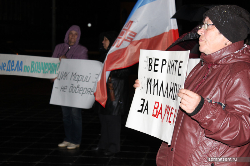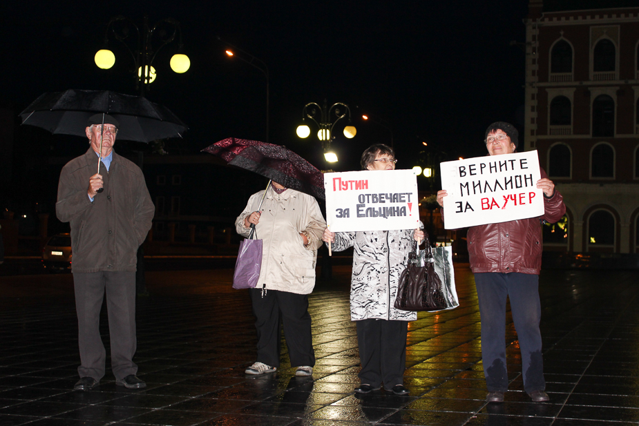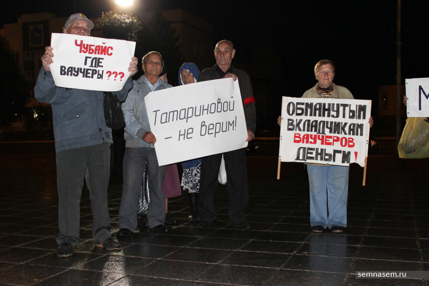 Участники пикета потребовали отменить итоги ваучерной приватизации, привлечь к уголовной ответственности руководство чековых инвестиционных фондов и отправить в отставку назначенцев бывшего главы региона.