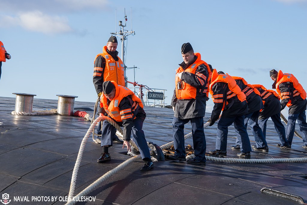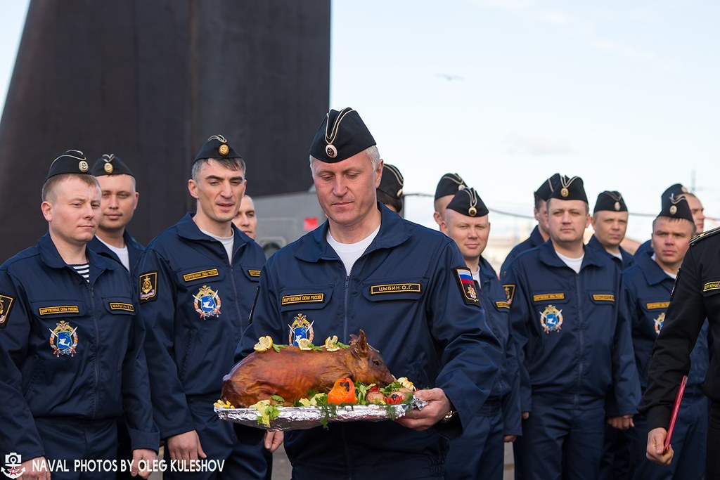 Контр-адмирал Аркадий Романов принял доклад командира корабля капитана 1 ранга Олега Цыбина об успешном выполнении поставленных задач и прибытии в пункт постоянного базирования, поздравил подводников с возвращением домой и поблагодарил за службу. По традиции подводников встретили жареным поросёнком.