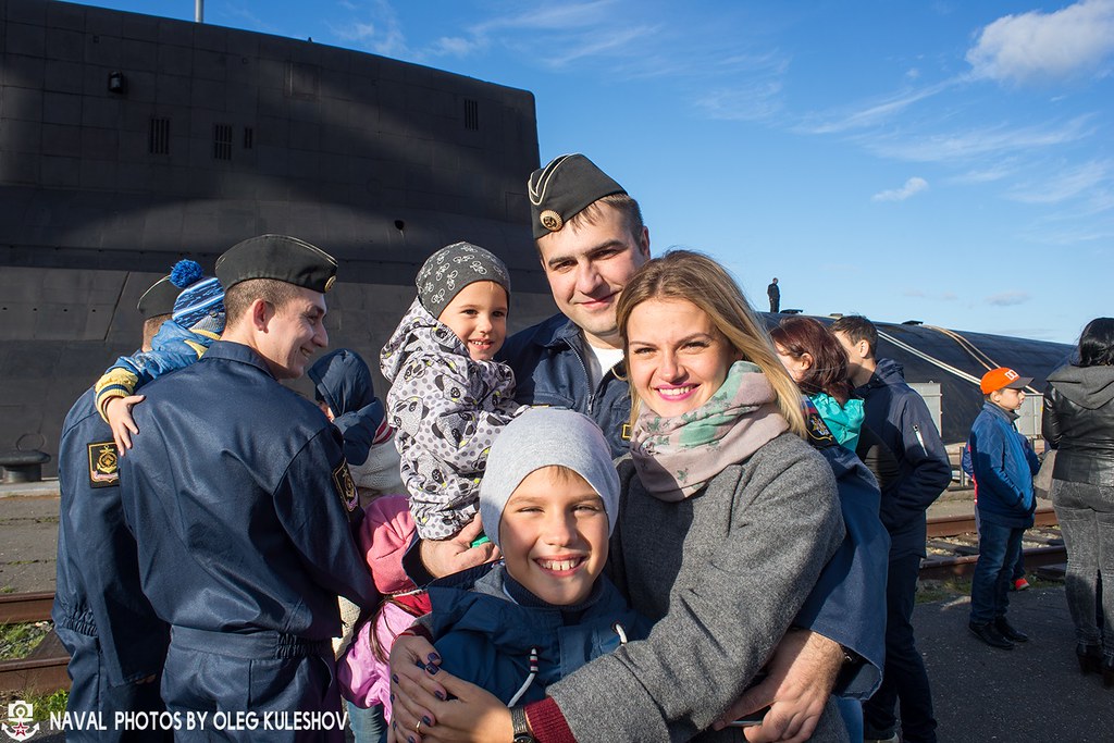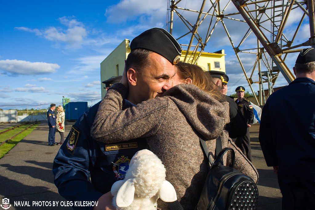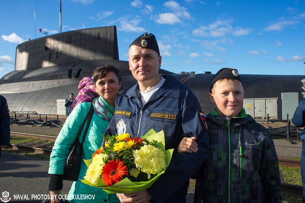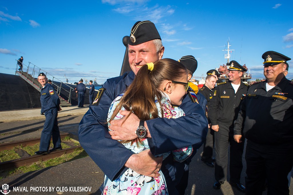 На причале экипаж подводного крейсера встречал командир Беломорской Военно-морской базы контр-адмирал Аркадий Романов, который в своё время им командовал. Также подводников встречали их семьи, с которыми они не виделись с весны.