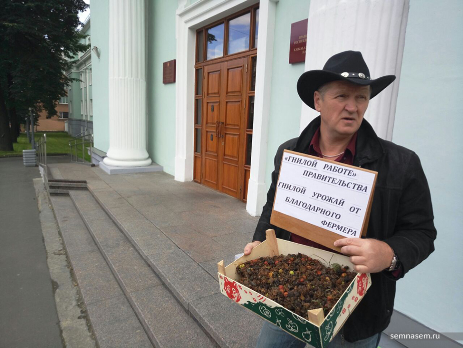 Farmer from the Prionezhsky district Mikhail Zenzin held a single picket on September 6. The man came to the entrance of the region administration with a box of rotten berries and poster: 'Rotten harvest for the rotten work of the government from a grateful farmer'.