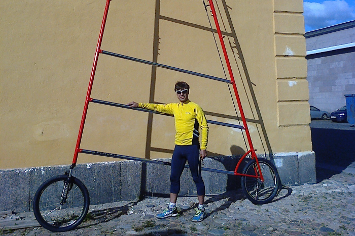 Петербуржец Игорь Баронас собрал велосипед высотой 6,43 метра. Фотографии изобретения он опубликовал в соцсетях.