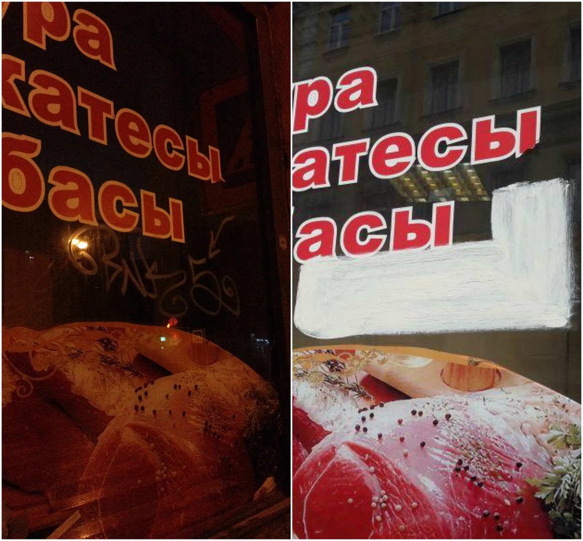 Витрину магазина в центре Петербурга, вместо того чтобы отмыть от рисунка, замазали белой краской, жители Васильевского острова предупреждают прохожих о выливающейся из окна моче, а в ЦПКиО ставят скромные ограды, чтобы спасти газон от посетителей.
