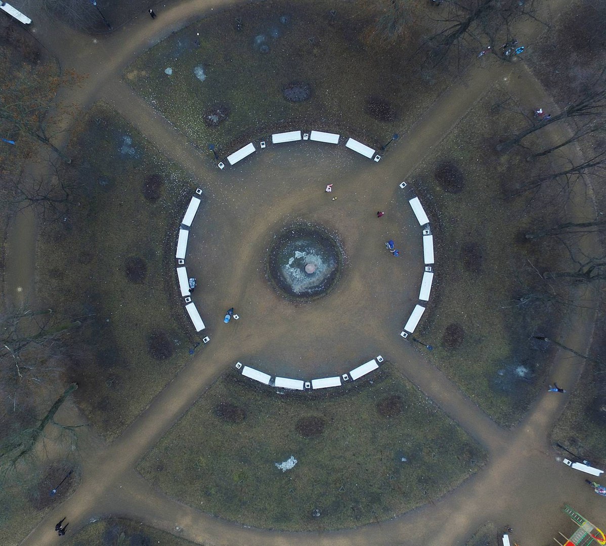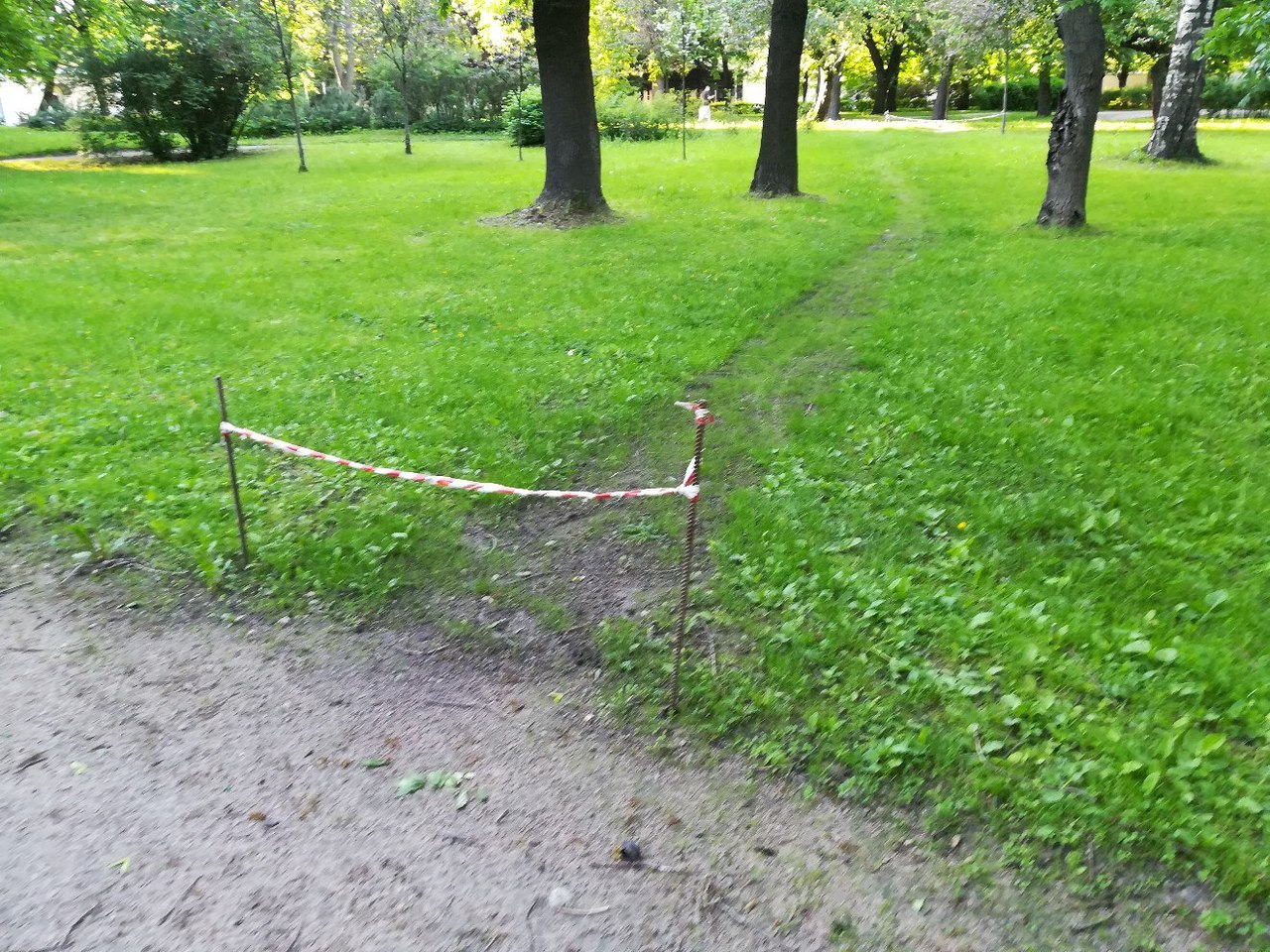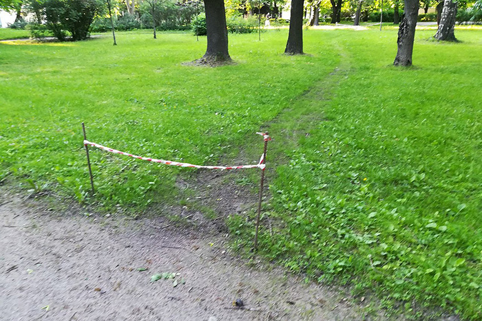 Такой конструкцией в парке постарались оградить протоптанную на газоне тропинку от пешеходов.