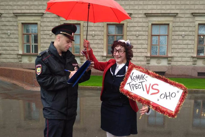 Клоуны театра «Комик-трест» провели одиночные пикеты у петербургского Закса с требованием запретить показ фильма «Оно». Артисты считают, что картина порочит честь их профессии.