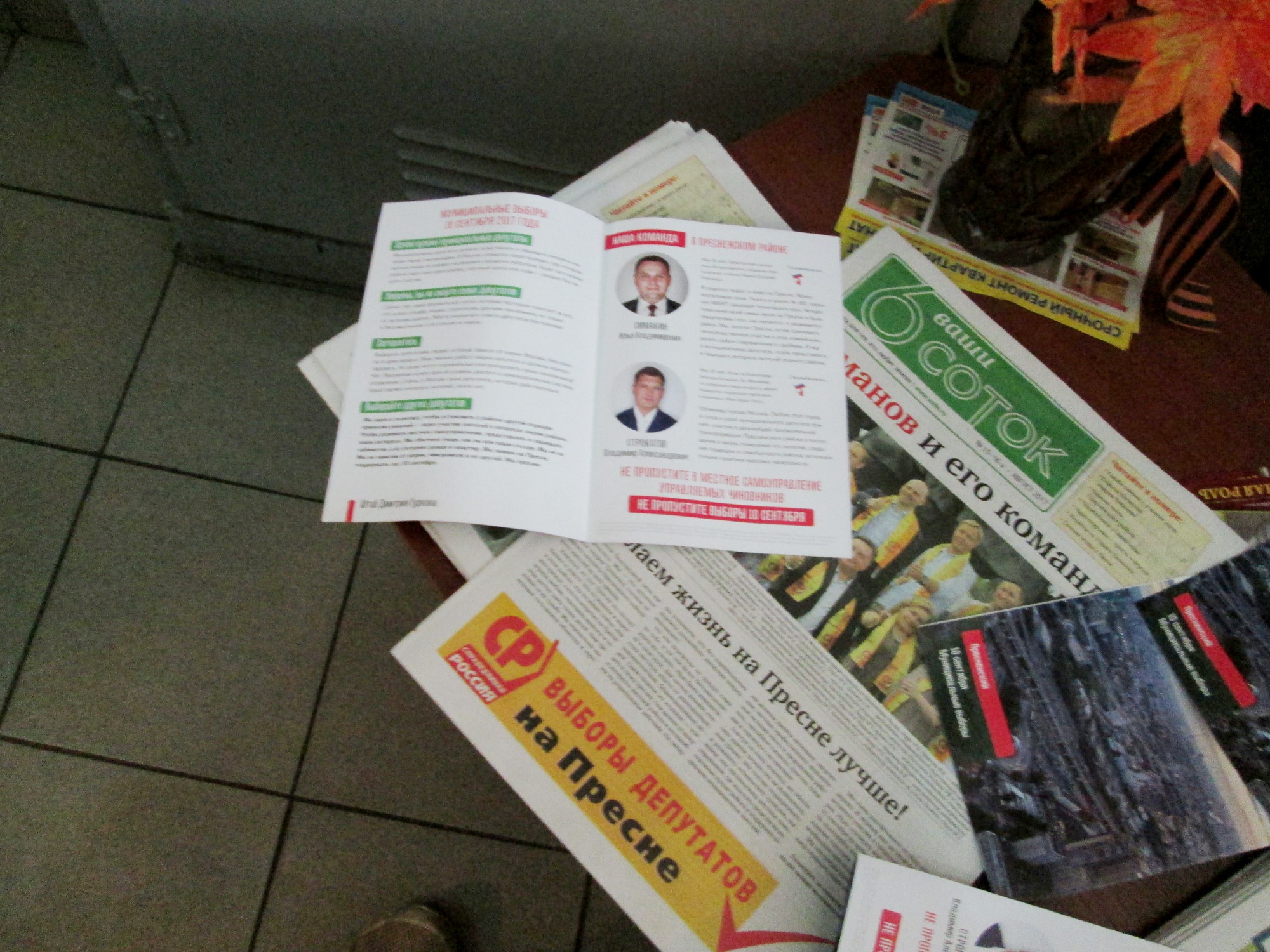 Предвыборная агитация в подъезде жилого дома polit.ru Вдобавок ко всему в столице сейчас с проблемами сталкиваются даже те, кто хочет проголосовать: в районных комиссиях, где осуществляется досрочное голосование, далеко не всем удается исполнить свой гражданский долг. От избирателей требуют не только заявления, но и документ, который подтверждал бы невозможность голосования 10 сентября по месту регистрации — например билет, рабочее удостоверение и т. д. Правда, тут глава Центризбиркома Элла Памфилова встает на сторону московской избирательной вертикали: она заявила, что члены избиркомов «не ущемляют право на досрочное голосование, но оно должно быть обоснованным».