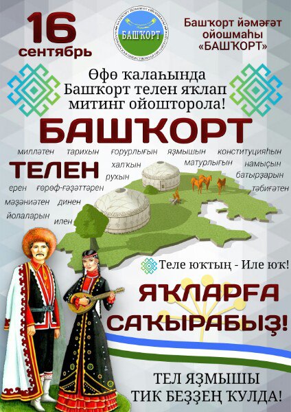 В администрации Уфы отказали в проведении мероприятия общественной организации "Башкорт", которая намеревалась 16 сентября провести митинг в защиту башкирского языка на площади перед Дворцом спорта. В уфимской мэрии ответили им, что все разрешенные площадки уже заняты. Как сообщил один из лидеров "Башкорта" Фаиль Алсынов, чиновники мэрии не предложили им никаких альтернативных вариантов. В организации считают фактический отказ в проведении митинга незаконным и заявляют, что всё равно проведут мероприятие в заявленное ими время и в заявленном месте.
