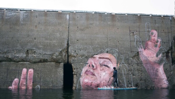 Серфингист и художник Шон Йоро (Sean Yoro) сделал рисунок в гавани Сент-Джон в Канаде, которую омывает залив Фанди. В течение нескольких месяцев он делал граффити с изображением девушки на восьмиметровой стене, которая частично скрывается под водой.
