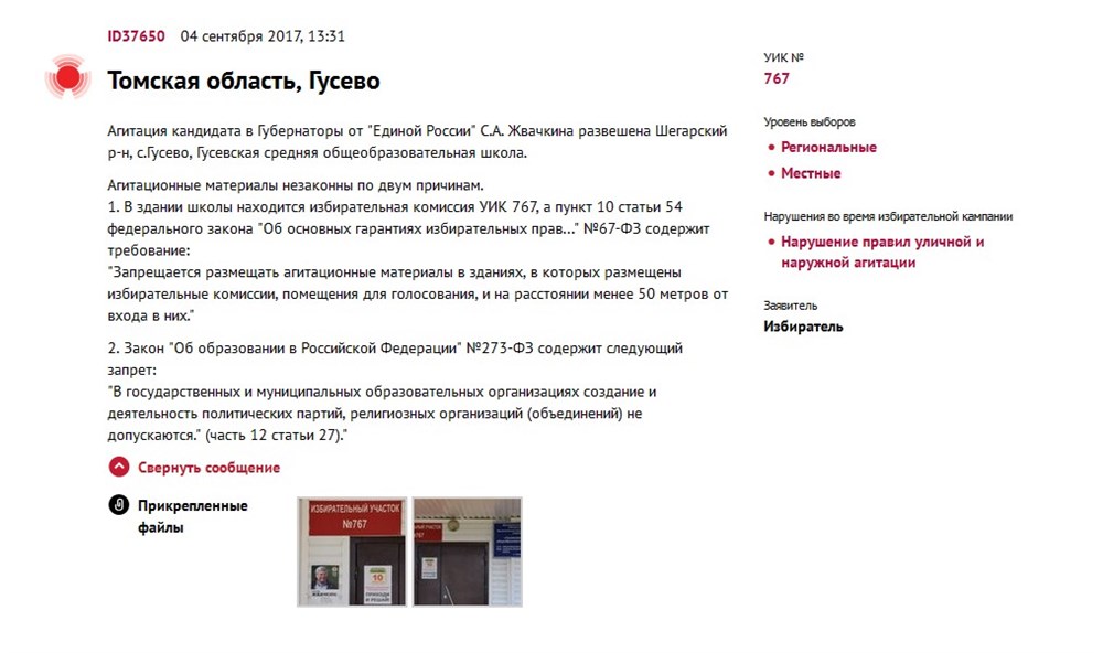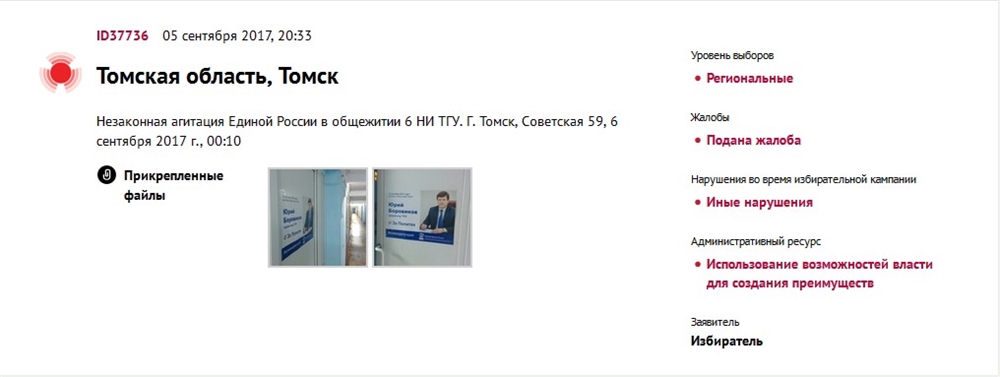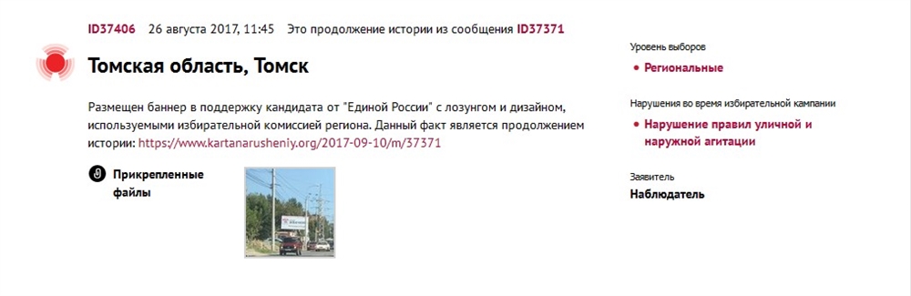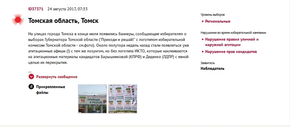 Фото: www.kartanarusheniy.org/ Предвыборная кампания в Томской области сопровождалась периодическими «скачками» ввиду активности отдельных кандидатов. Имели место нарушения, связанные с распространением агитационных материалов кандидатов: это либо их порча, либо размещение в запрещенных законом местах. Безусловно, чем ближе день голосования, тем больше агитации появляется в том числе в тех местах, которые закон запрещает. В связи с этим рост количества публикуемых нарушений за последнюю неделю является весьма закономерным. К слову, механизм работы «Карты нарушений» заключается в следующем: публикуемые данные обрабатываются Центральной избирательной комиссией РФ, затем поступают в региональные избиркомы, где происходит выяснение деталей на местах. По отдельным фактам выявленных нарушений в Томской области материалы направлены в полицию. В целом, крупных нарушений не наблюдалось – данный вывод можно сделать, исходя из данных, преступаемых от коллег из других регионов», — рассказала Анна Юдина.