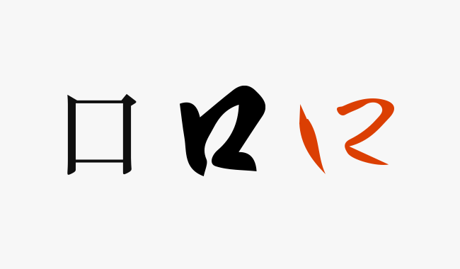Слева снизу — печатный иероглиф рот. А в центре и справа — тот же иероглиф, написанный от руки в правильном порядке, но быстро.