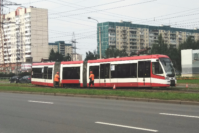 На проспекте Испытателей 10 сентября новый трамвай снова сошел с рельсов, сообщают очевидцы на портале «Мегаполис».