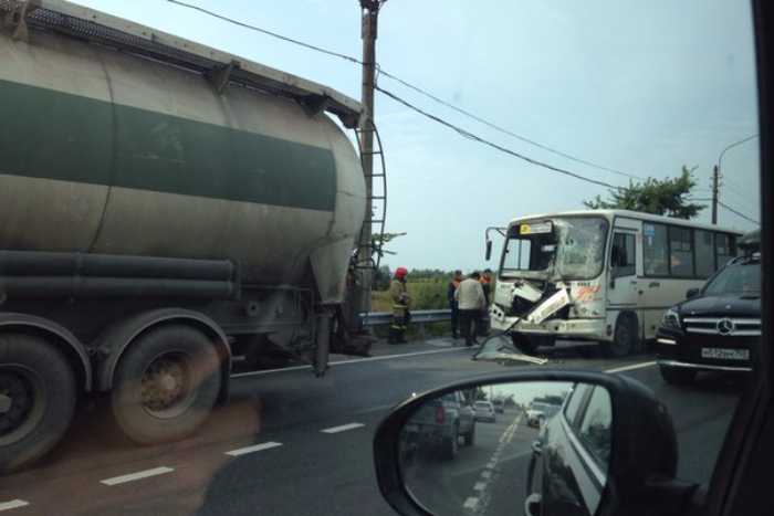 На Московском шоссе маршрутка врезалась в бензовоз. Пострадали три человека