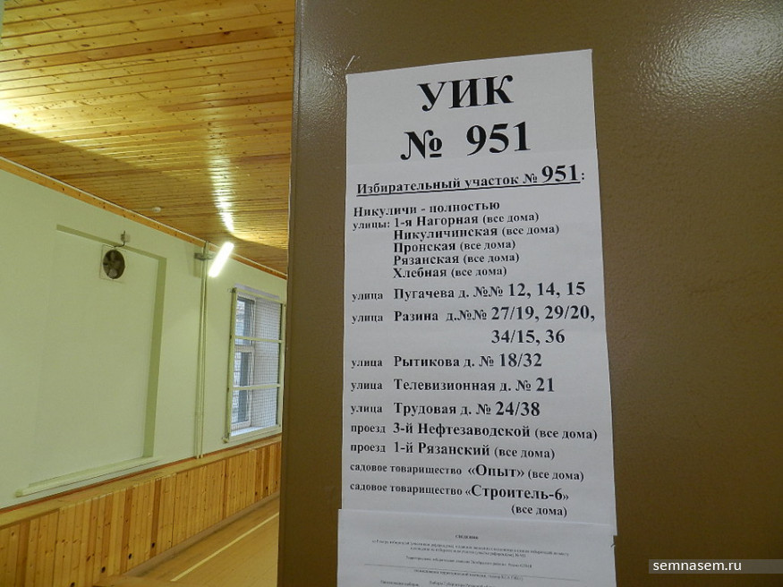 В 7:05 двери среднеобразовательной школы №41 (избирательные участки №951 и 952) на окраине Рязани, в поселке Шлаковый были открыты. Директор школы Владимир Зайцев изучил пресс-карту и указал на информационные стенды, пригласил осмотреть оба избирательных участка. Ближайший, что на первом этаже, разместился в спортзале. Члены комиссии были на местах, из наблюдателей присутствовала одна девушка. На вопрос, от какой партии, ответила просто: «Я от Любимова».
