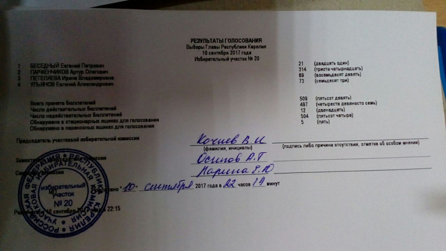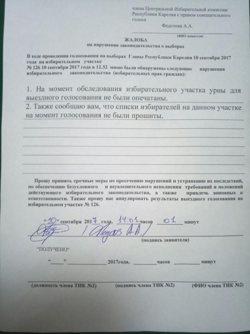 14:20 Наблюдатели «Справедливой России» зафиксировали ряд нарушений на избирательном участке №126: там не были прошиты списки избирателей, и не опечатаны урны для выездного голосования. В настоящее время замечания устранены, однако член ЦИК Карелии от КПРФ Александр Федотов подал в ТИК №2 жалобу с требованием аннулировать результаты выездного голосования на данном УИК.