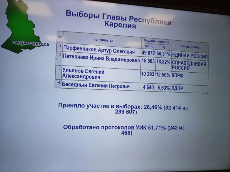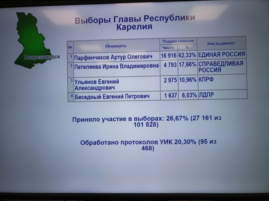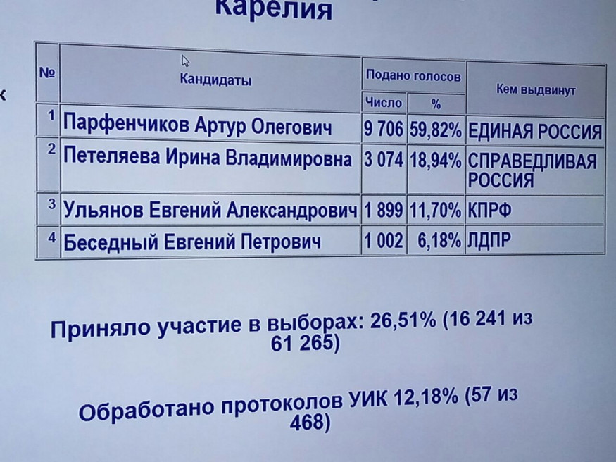 0:12 А вот и предварительные данные от ЦИКа Карелии после обработки 20% протоколов. Как сказал наш корреспондент, который наблюдает за подсчетом в ЦИКе Карелии, «Парфенчиков растет».