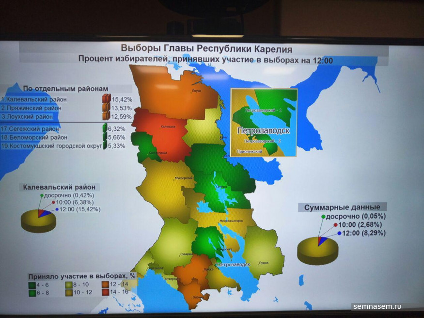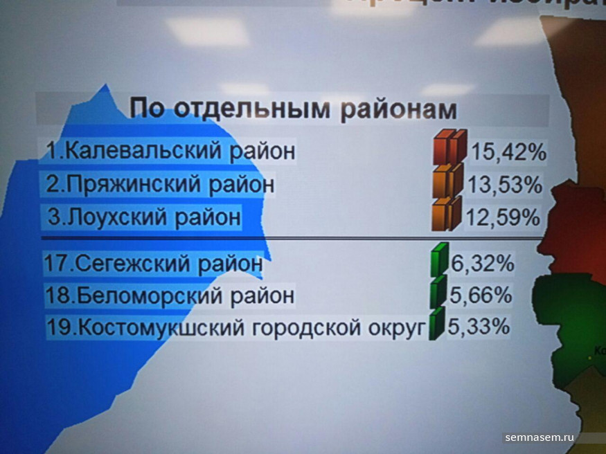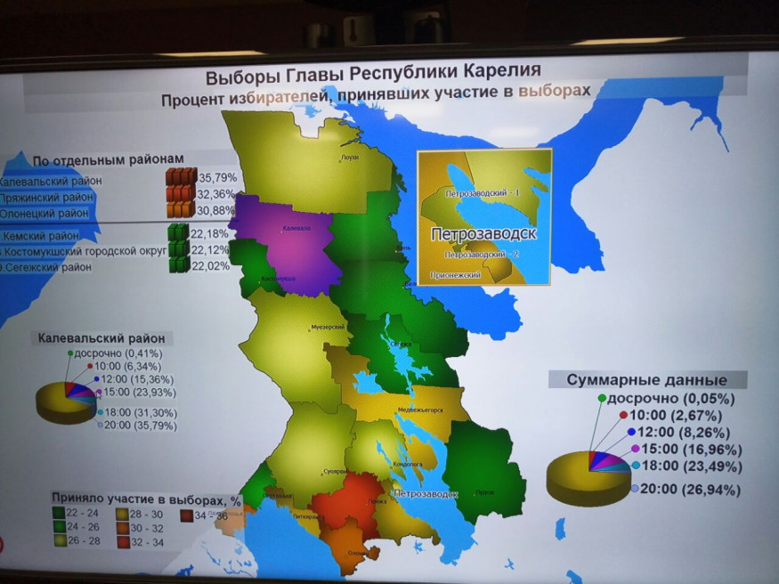 Явка по районам республики на 15:00: Калевальский район — 23,96%, Лахденпохский — 21,65%, Пряжинский — 21,53%, Олонецкий — 21,33%. Остальные районы пока не собрали и 20%. Самая низкая явка в Костомукше — 12,89%.