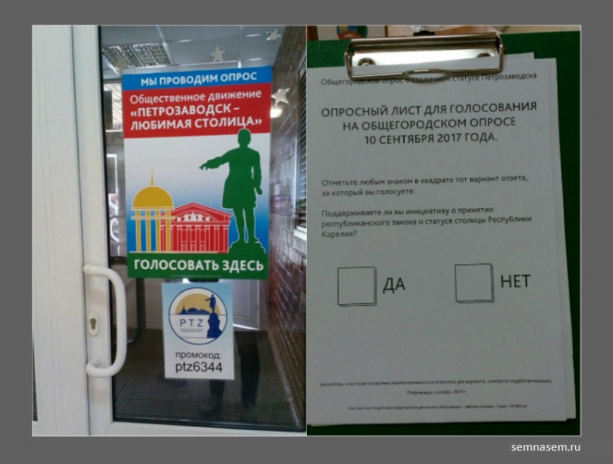 8:45 ЦИК признал лотерею незаконной, но все очень хитро. Наблюдатели прислали фото: рядом с афишей по поводу опроса о столичном статусе Петрозаводска висит промо-код. Когда гражданин выразит свое мнение в этом опросе, промо-код надо будет ввести в приложение, чтобы принять участие в… розыгрыше автомобиля. Вслух промо-код никто не называет, вот — висит, пожалуйста.