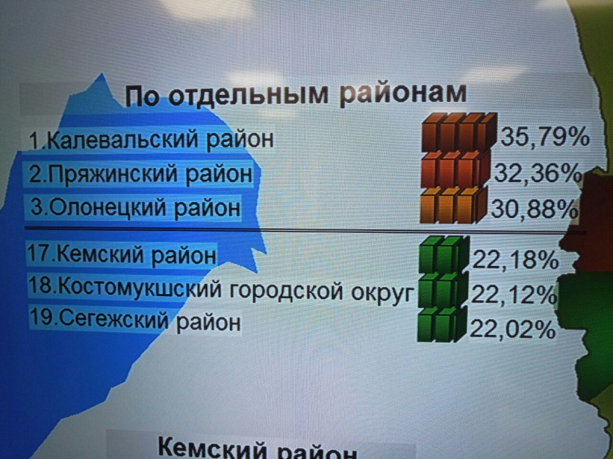 В лидерах — Калевальский район (31,35%) и Пряжинский район (29,19%).
