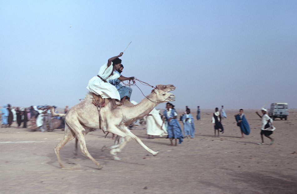 Почуяв тяжесть седока, лежащий верблюд встаёт сначала на задние, а потом на передние ноги так стремительно, словно пытается выбросить человека из седла. Естественно, я медленно сползаю с верблюда под откровенный смех кочевников. Молоденький солдат лихо прыгает в седло и, не шелохнувшись, возносится в небо на верблюжьем горбу. Он делает это отнюдь не с целью подчеркнуть мою неуклюжесть или похвастать своей ловкостью — мне кажется, мавританцы органически не способны даже к малейшему преувеличению своих достоинств, да и перед кем ему хвастать? Ему надоело сидеть целыми днями за рулём «Лендровера», и он, грациозно покачиваясь в седле, пускает верблюда в неторопливый галоп по широкому кругу, просто чтобы размяться.