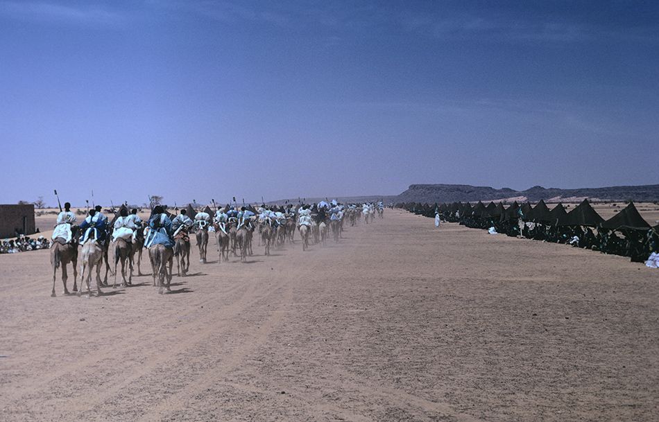 За городской площадью пустыня кажется взбугрившейся до самого горизонта: сотни верблюдов лежат, стоят, бродят на огромном пространстве вокруг Алега, создавая причудливый лабиринт, который продолжает городские кварталы. Хозяева верблюдов кочуют в радиусе ста километров от города и преодолели это пространство, покинув свои кочевья, специально к празднику.