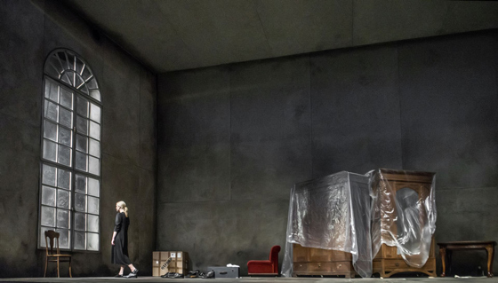 Первое действие выдержано в узнаваемой люповской стилистике. Медленность и вымороженность темпоритма, загадочная хореография шагов, поднимающая бытовые операции по разбору, чистке и глажке вещей покойного хозяина дома до загадочного ритуала, принципиальная интровертность актерских рисунков, в которых эмоции и влечения загнаны внутрь, а не выставлены к зрителю. Растерянная домоправительница Циттель (Эгле Габренайте) вновь и вновь рассказывает о профессоре, о его жизни, родственниках и привычках. Ей ассистирует немногословная девушка Герта (Раса Самуолите), у которой, кажется, были особые права на профессора Шустера — то ли тайная любовница, то ли ласковая смерть, принявшая самоубийцу в свои объятия. Закольцованный, лишенный бытовой логики, поэтически ритмизованный текст Бернхарда получает убедительный сценический коррелят: танцуя с утюгом, великолепная Габренайте, не разрушая северной сдержанности внешнего ролевого рисунка, внутренне экстатична, и ее загадочные вариации с перечислением имен каких-то неведомых профессоров и малозначительных обыденных коллизий держат зрителя в гипнотическом напряжении. Люпа обозначает масштаб трагедии осиротевшего дома, но и подбрасывает зрителю, словно камешки, остраняющие и снижающие детали. Все эти утюги, ботинки и сорочки как-то портят трагический лад. А перед антрактом явится еще и привидение профессора на видеопроекции. Он вовсе не выглядит сокрушенным, а упорно и воодушевленно разглаживает белоснежную сорочку.